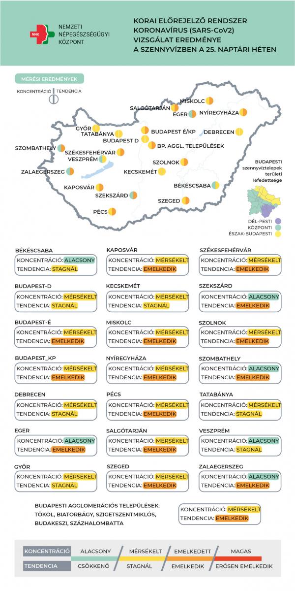 Nőtt a szennyvízben a koronavírus koncentrációja. A mintavételi helyek többségénél (15 helyszínen) emelkedő tendencia tapasztalható, míg 7 településen a mért értékek stagnálnak – írja a koronavírus tájékoztató oldal. Csökkenő tendencia egyetlen városban sem tapasztalható.